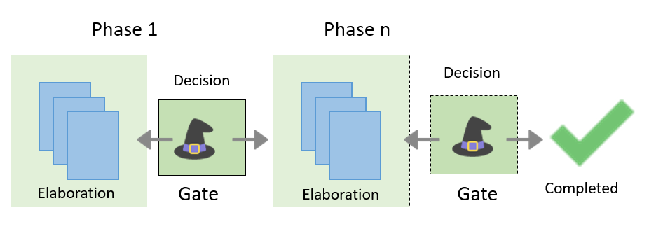 At the end of the elaboration, when a decision is needed, the project phase reaches the decision gate where the gatekeeper is in charge. While the phase is in the gate, the project team can no longer edit the project. After the last gate has been passed, the project can be set to completed.