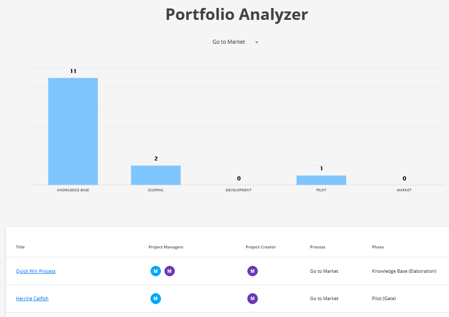 The portfolio analyzer displays the progress on projects. A bar chart represents the number of projects per phase. A click on the bar displays a list of the corresponding projects. The chart displays running projects (draft, completed and canceled projects are not considered).