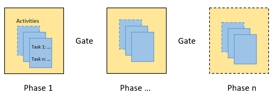 A process runs through one or more phases where each phase consists of multiple activities with tasks to be completed. For each activity, you can define tasks that have to be completed by the project team. A process consists of phases, which are implicitly followed by gates. Thus, a process is an alternation of phases and gates.